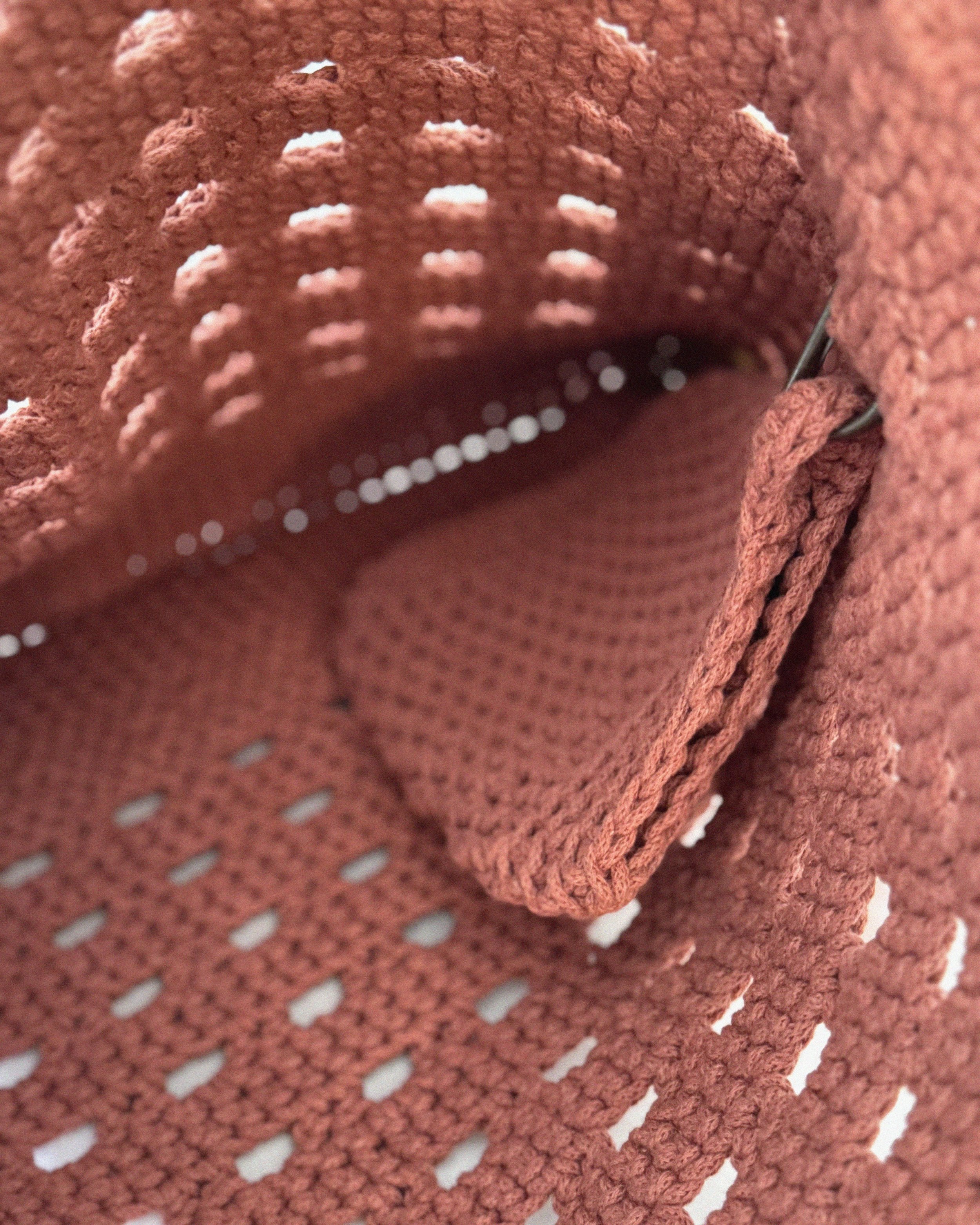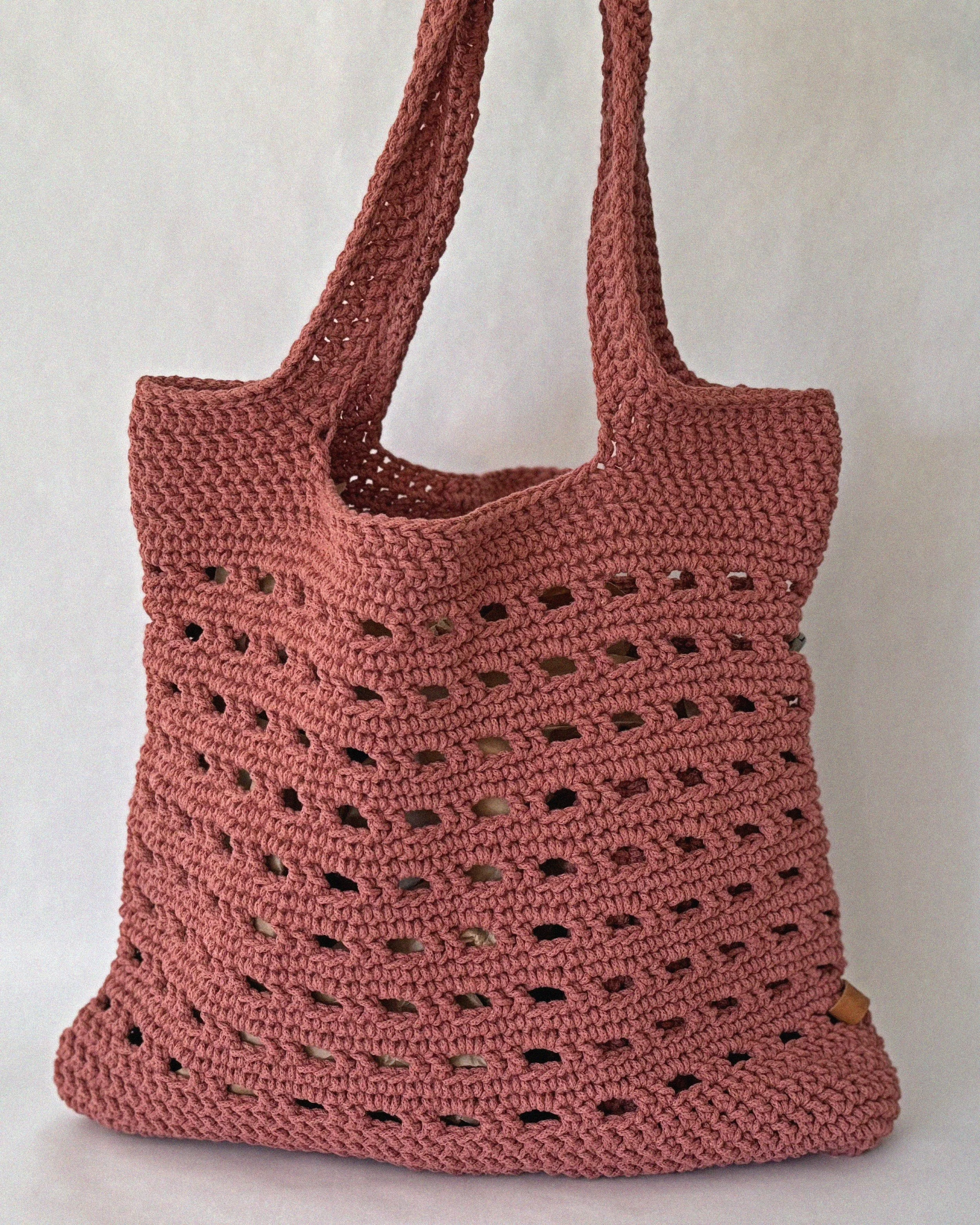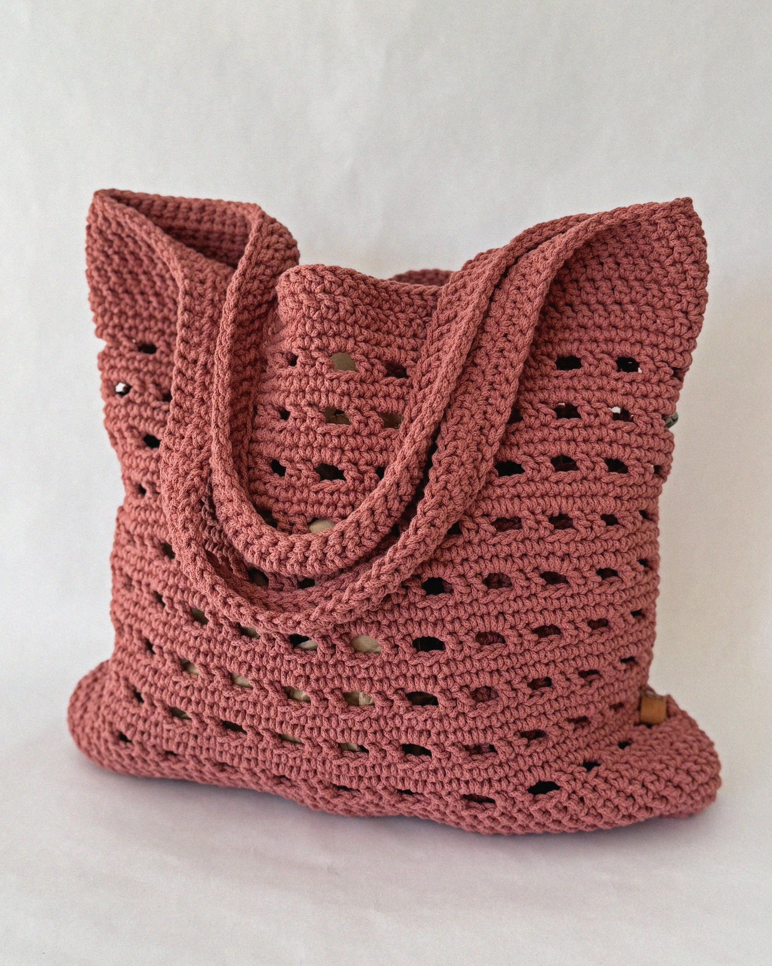 This beautifully hand-crocheted tote bag in a warm rose pink hue combines functionality with charm. The bag features a sturdy, textured base and a breathable openwork body created with evenly spaced eyelets—perfect for shopping, beach days, or casual outings.